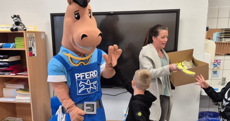 Passend dazu bekamen wir Besuch von Pferdinand und Maike Daase von der Firma Rüggeberg in Marienheide. Sie hatten eine tolle Überraschung dabei: Jedes Kind der ersten Klasse bekam eine leuchtend gelbe Warnweste geschenkt!